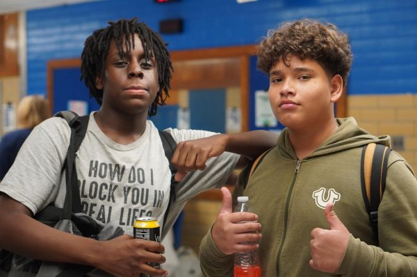 Sophomore Le’Sean Roberts and freshman JB Borjas Rodriguez pose for a photo after visiting the Students of Color Alliance’s agua fresca booth on Sept. 30.